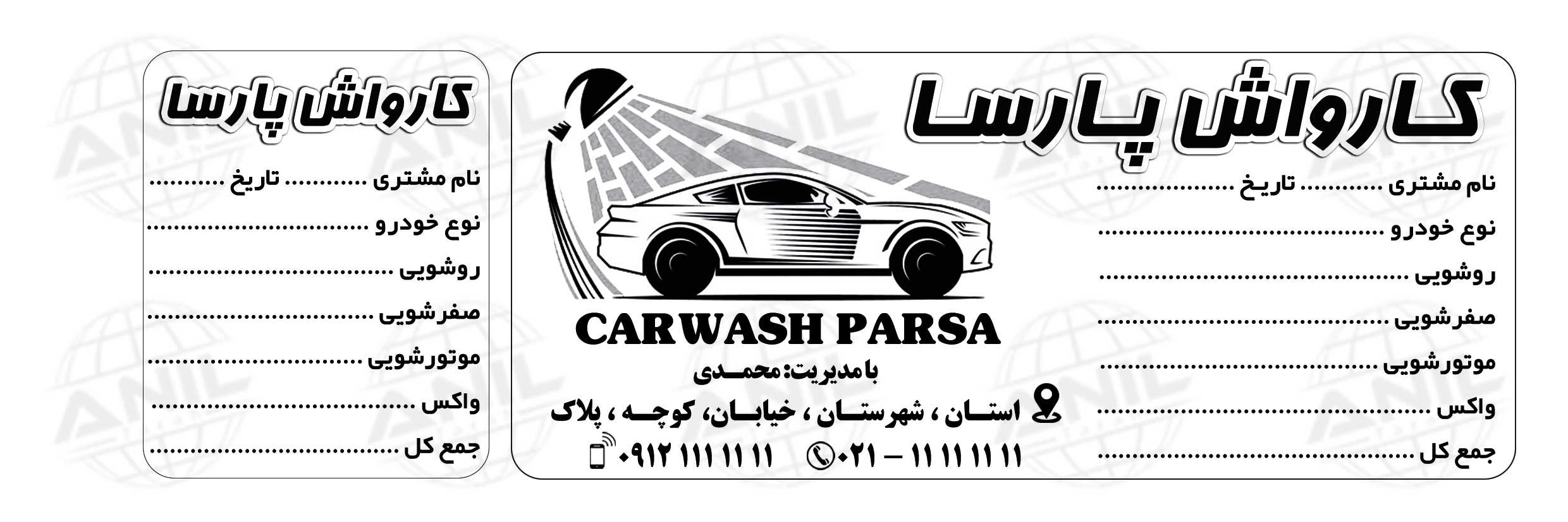طرح لایه باز قبض کارواش در فرمت PSD ارائه شده است و تنها با نرم افزار Adobe Photoshop قابل استفاده می‌باشد. ابعاد قبض کارواش 21×7سانتی‌متر با رزولوشن 300dpi ، مشکی و سفید است.